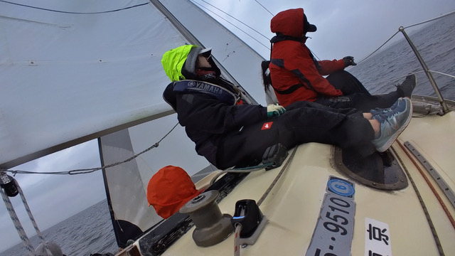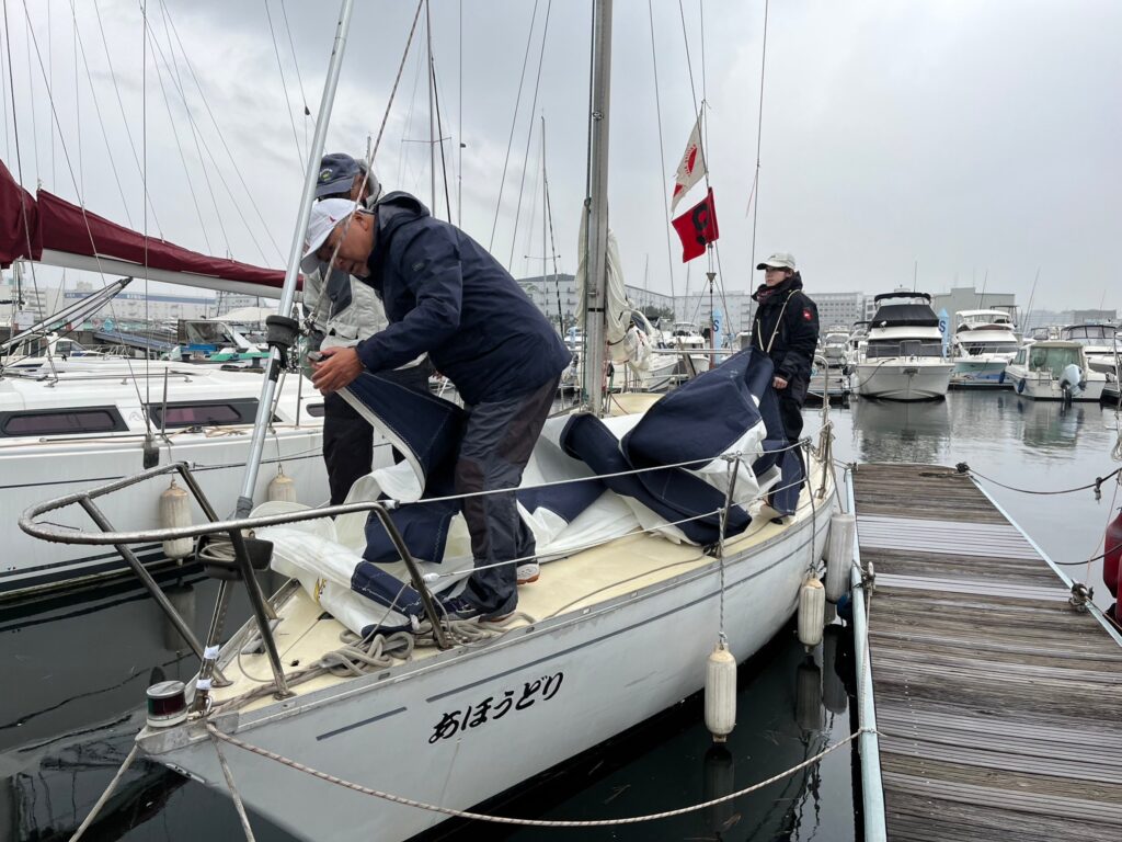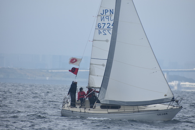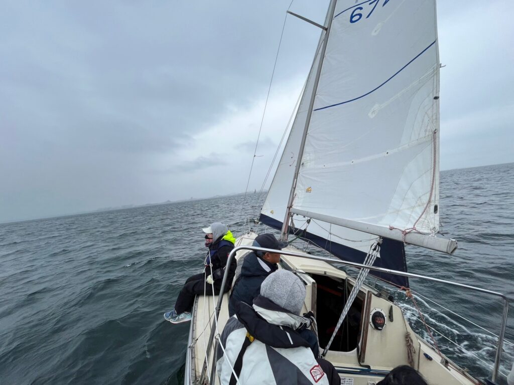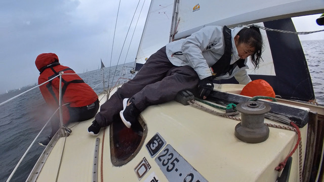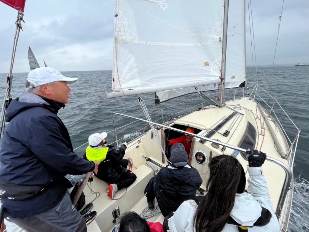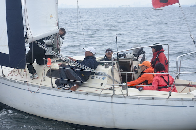スキッパーは堀江さん、ヘルムスは小倉さんと菊池さん、メイントリムは金子さんととのがいち、ジブトリ、バウマン、ウエイトは、児玉さん、そえださん、体験参加の松田さんが担当。