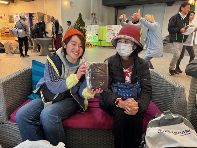 今回の賞品は電気あんか。その場で、体験参加してくださった、現役の国体(こくたい)セーリング選手の松田さん(まつたさん)に贈呈させていただきました。近日ご入会いただける予定です。電気あんかは賄賂ではありません。