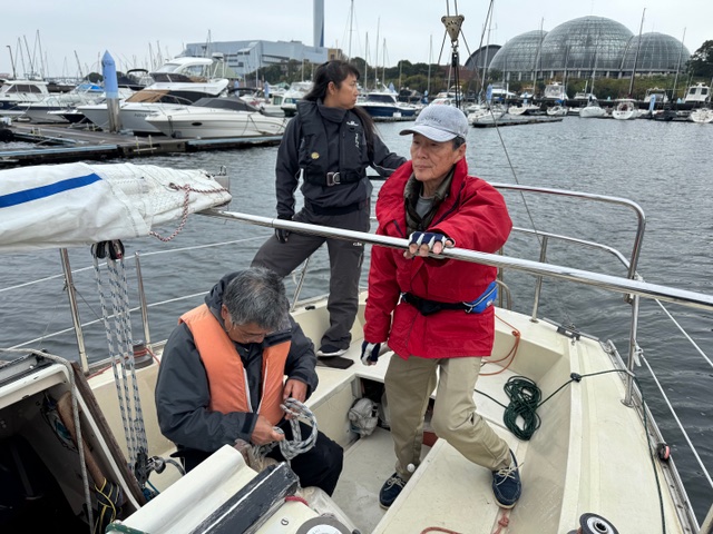 永井さんの指導のもと、玉木さん、古庄さん、そえださんが実施。ブラインドの佐藤さんと私も、風速14ノット程度のもと、ぴたっと停船。やはりあれぐらいの風でも船を止めることができるということは、自信につながるし、いざというときに落ち着いて行動できる要因のひとつになると思いました。