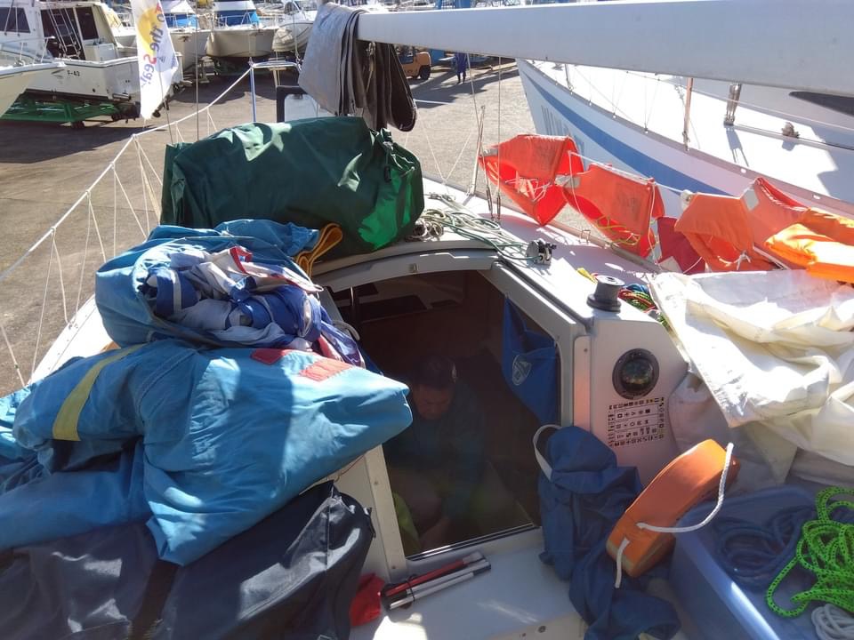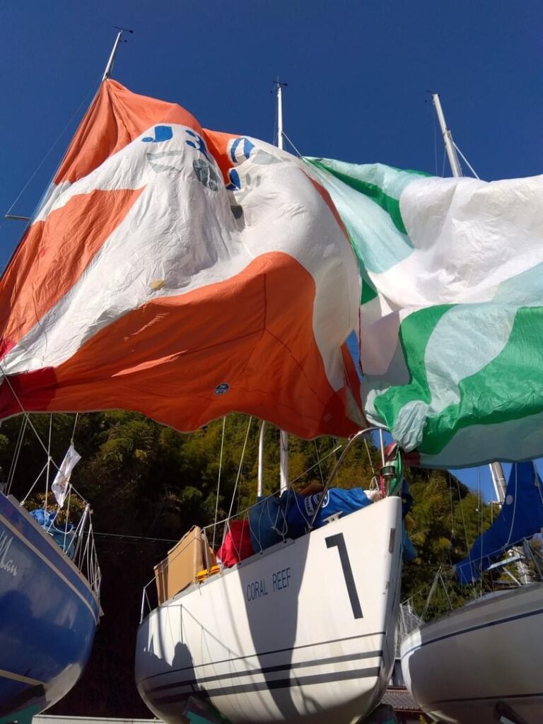 まずはキャビンやロッカーの中の物を外に出し、日干しに取り掛かる。その後はキャビンやロッカーの拭き掃除。マストのバランス、サイドステイの張りを調整した頃には、お昼となり、ウッドデッキでランチタイム。