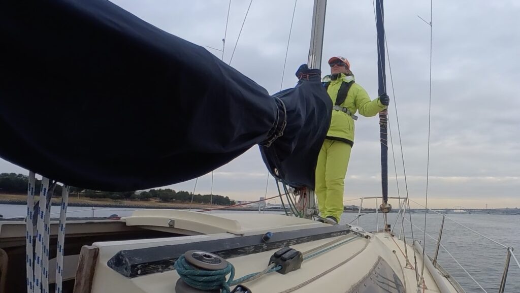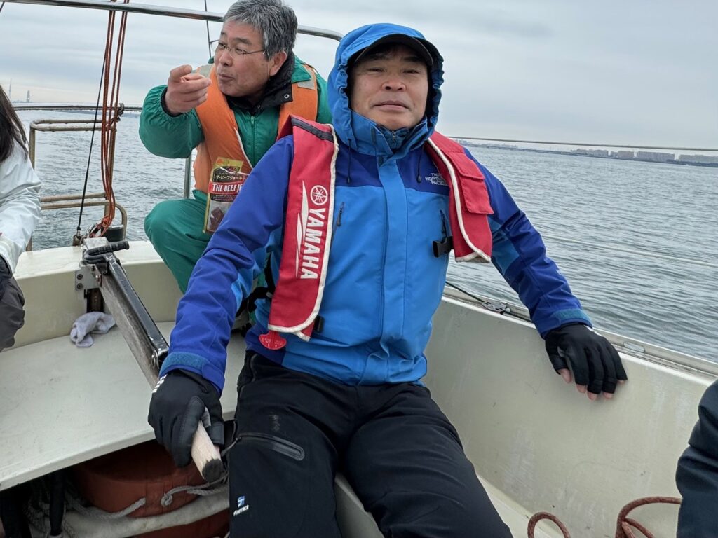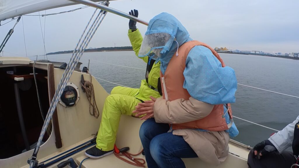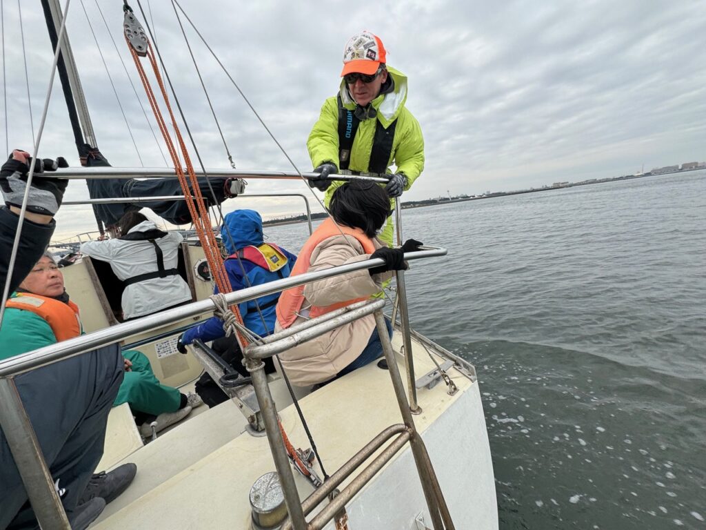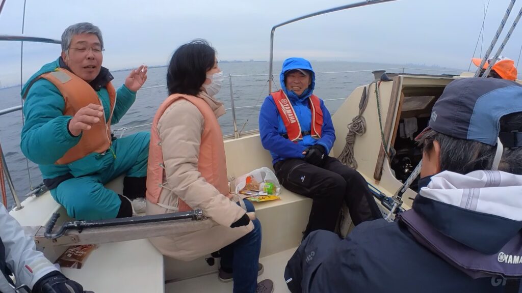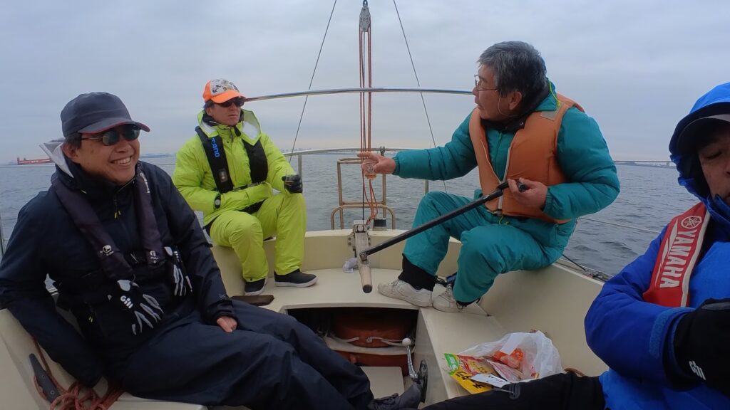 さて、東京湾も中央付近にくると、急に気温がさがり、かじかんだ指でおつまみの袋があかない。キャビンでは、やかんでお湯を沸かしていて、ぽかぽかとあたたかかっため、体験者さんと、仕事について、体験者さんが見てきた中途視覚障がい者の人々の苦労について、そしてもちろんブラインドセーリングの素晴らしさについてなど、結構長時間話していた。