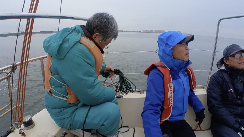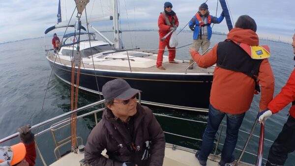 若洲付近に戻ってきた頃、大きなヨットがフレンドリーに接してきて、「速いですねぇ」というようなことをおっしゃる。もちろん向こうのほうが圧倒的に速い。しかもこちらは、実は機帆走していた。機帆走しているのに、帆走だけのヨットのほうが何倍も速い。