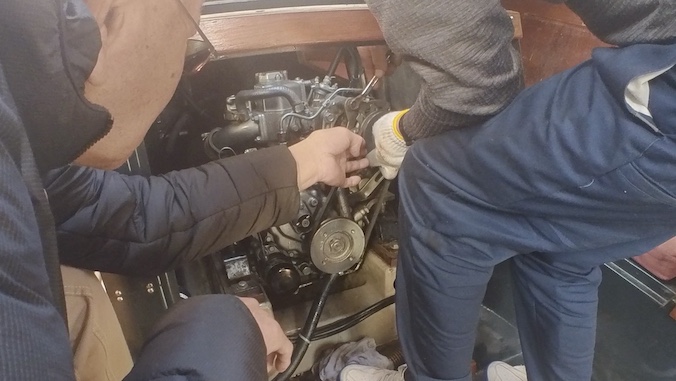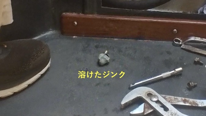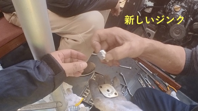 そして、私が今回びっくりしたナンバーワンの作業「ジンクの取り替え」。ジンクとは、防蝕亜鉛でエンジンが電蝕しないようにする部品。形状は、親指ぐらいの太さで、薄い紙のパッキンと金具を挟み、ボルトで締めてから取り付ける。使い続けると、どんどん溶けてしまう。前回いつ交換したか、整備記録がないのでわからないが、角がなくなるくらい溶けていた。「海水から守るために溶ける部品」に感動した。古いジンクさん、今までご苦労さまでした。