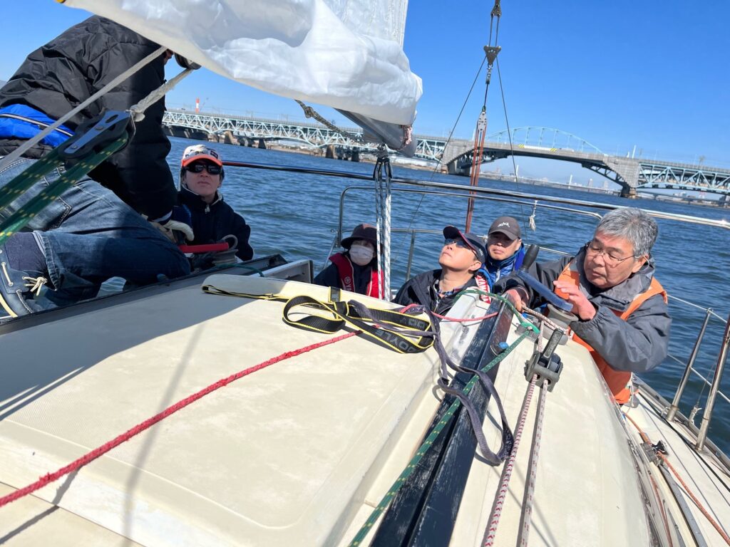 橋の手前で180度回頭してみなでメインセールダウンと片付け