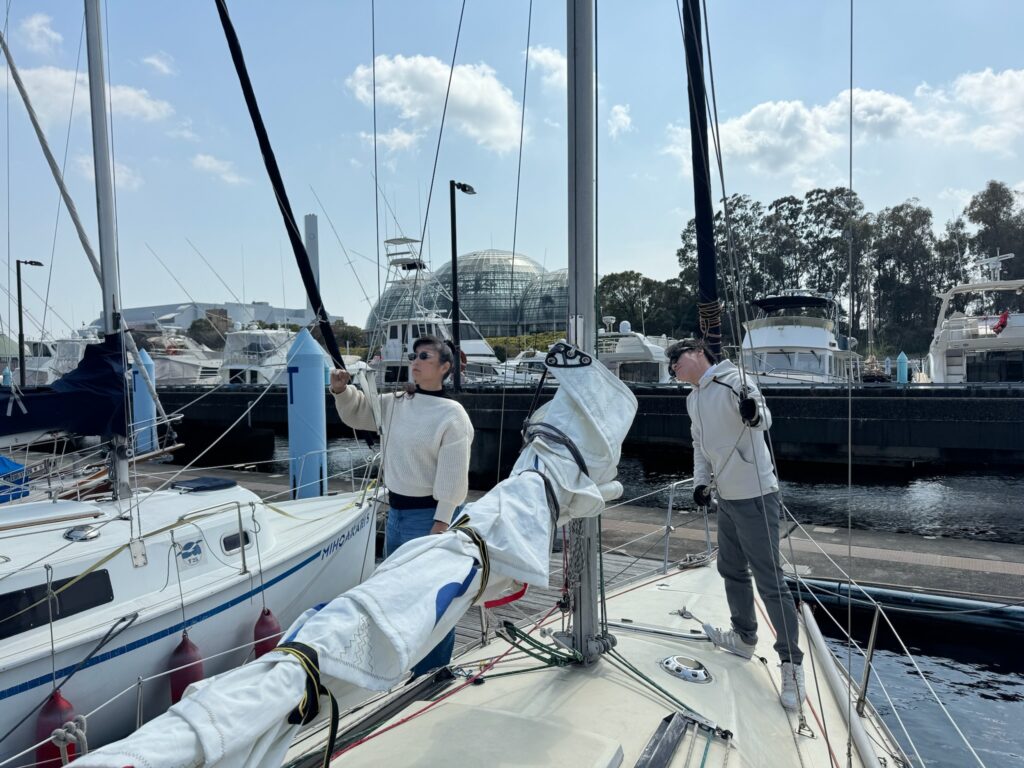 メインハリヤードでマストの左右の傾きを調べたところ、右舷に傾いていました。