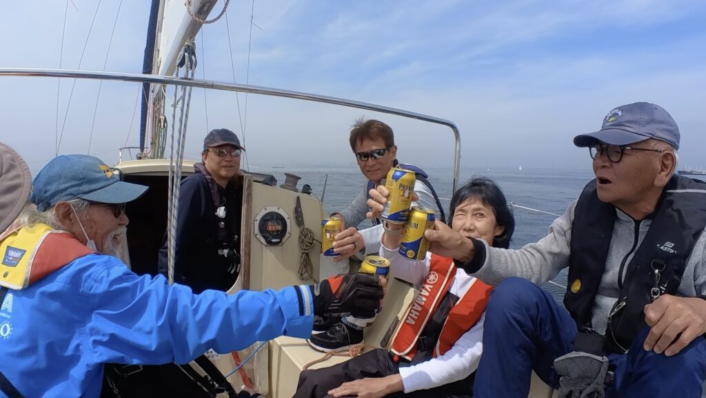 1時間と少しかけていった道を、戻る。機走だったが、ティラーをみずたさんが握る。初めはそえだがサポートをしていたが、途中から、体験者さんにご指導していただく。このかたは、パラリンピック監督としてご活躍なさったかた。みずたさんに指導していらっしゃる内容を聞き漏らさないように、耳を大きくして聞いていた。その横では、「お疲れさま〜!」と、乾杯の声が聞こえた。なんともいえない幸せを感じることができた。