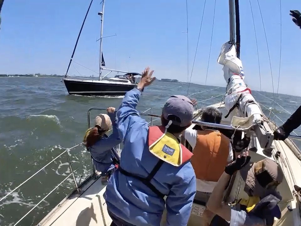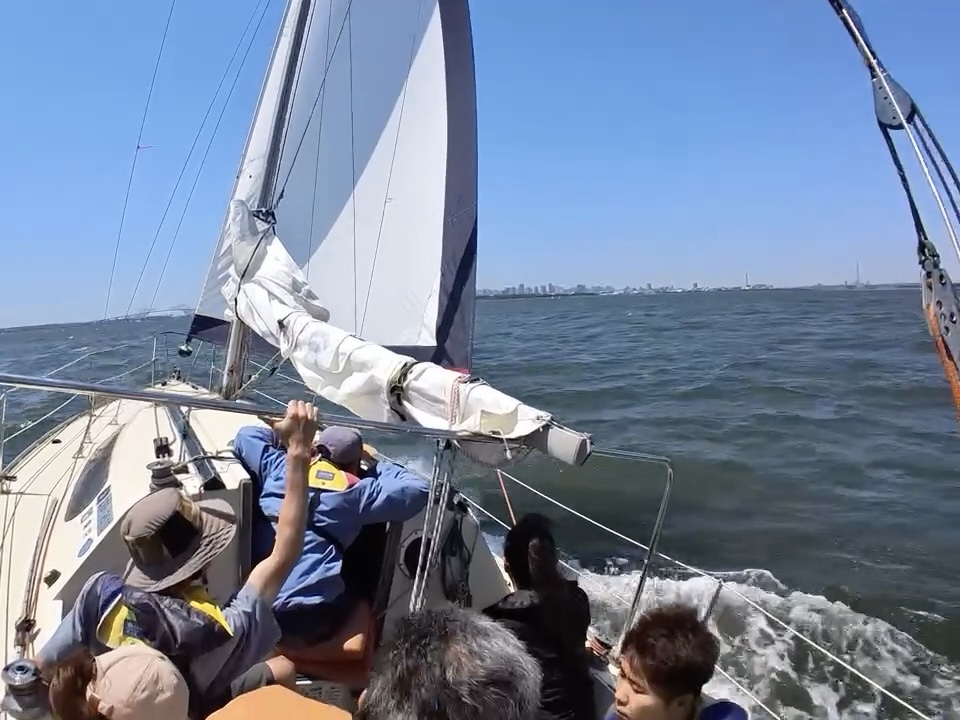 そのような体験者二名を迎えての活動となり、波風穏やかな中での良いセーリングとなることを期待したのですが、帆走にはやや厳しい海となりました。しかも5月5日の子供の日!乗っているのはおこちゃまではないけど、体験者さんがいるのにメイストームと呼んでよい中での東京湾クルーズとなってしまいました。
