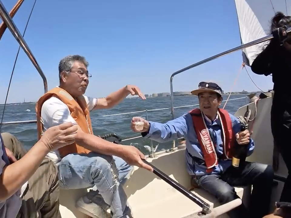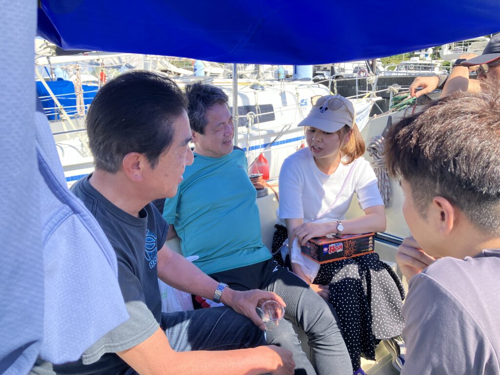 そんなこんなでしたが、帆走に変わったところで、いつものごとく、スパークリングの泡を上げて皆で乾杯してましたが・・・。