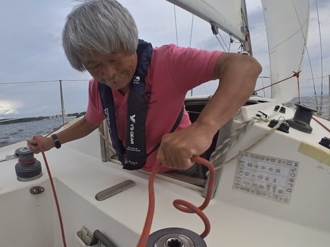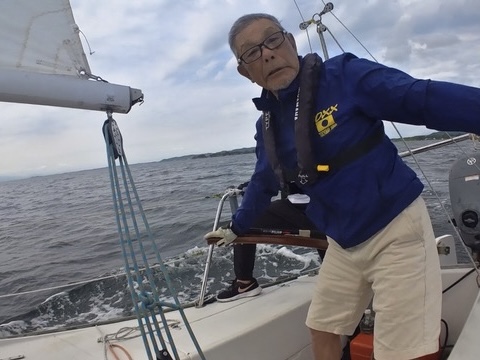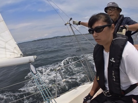ほとんどティラーを持つことのない私も、今回は上下マーク回航を何度かおこないました。風が弱い最初のうちに、私はティラーの練習をしたかったので、風があがってきたころ、そえださんと担当を交代するようにと言われて、ほっとしました。