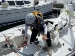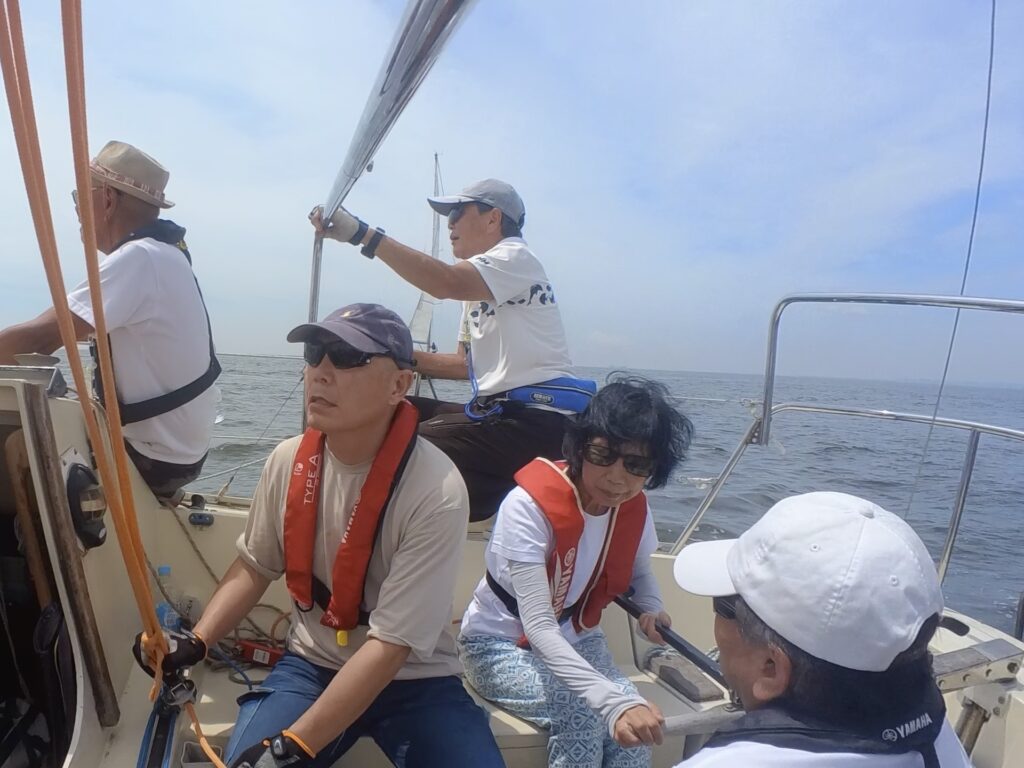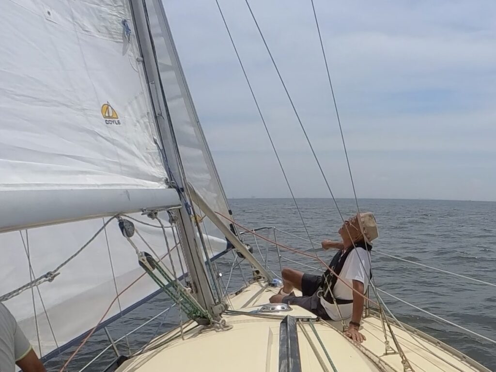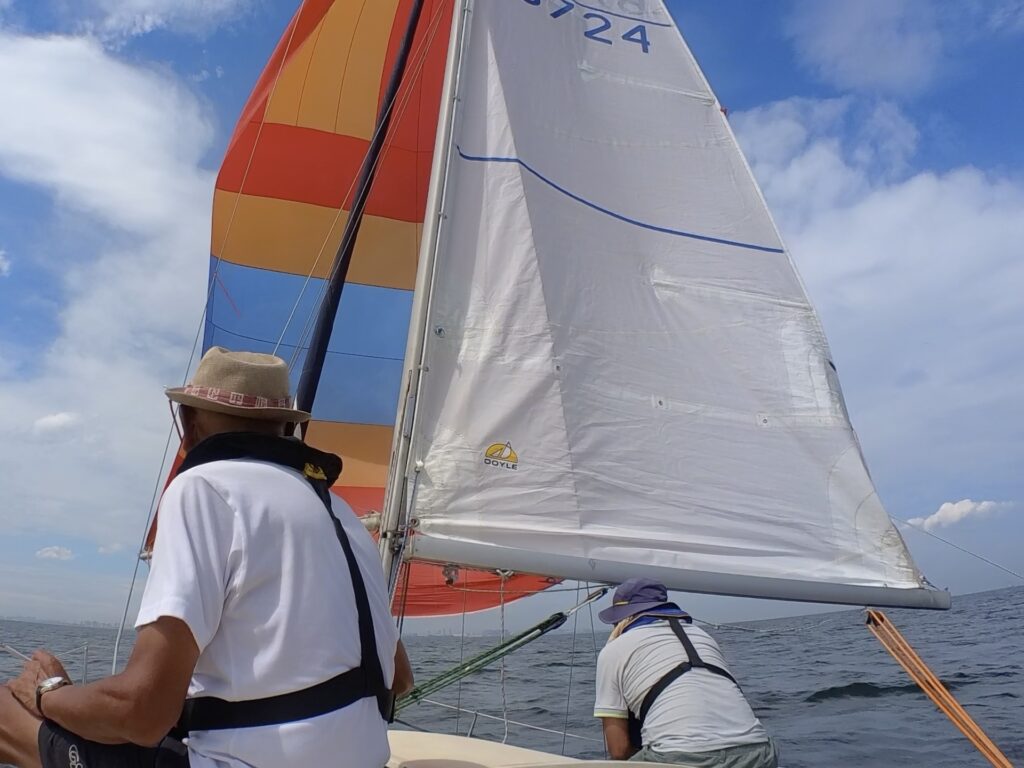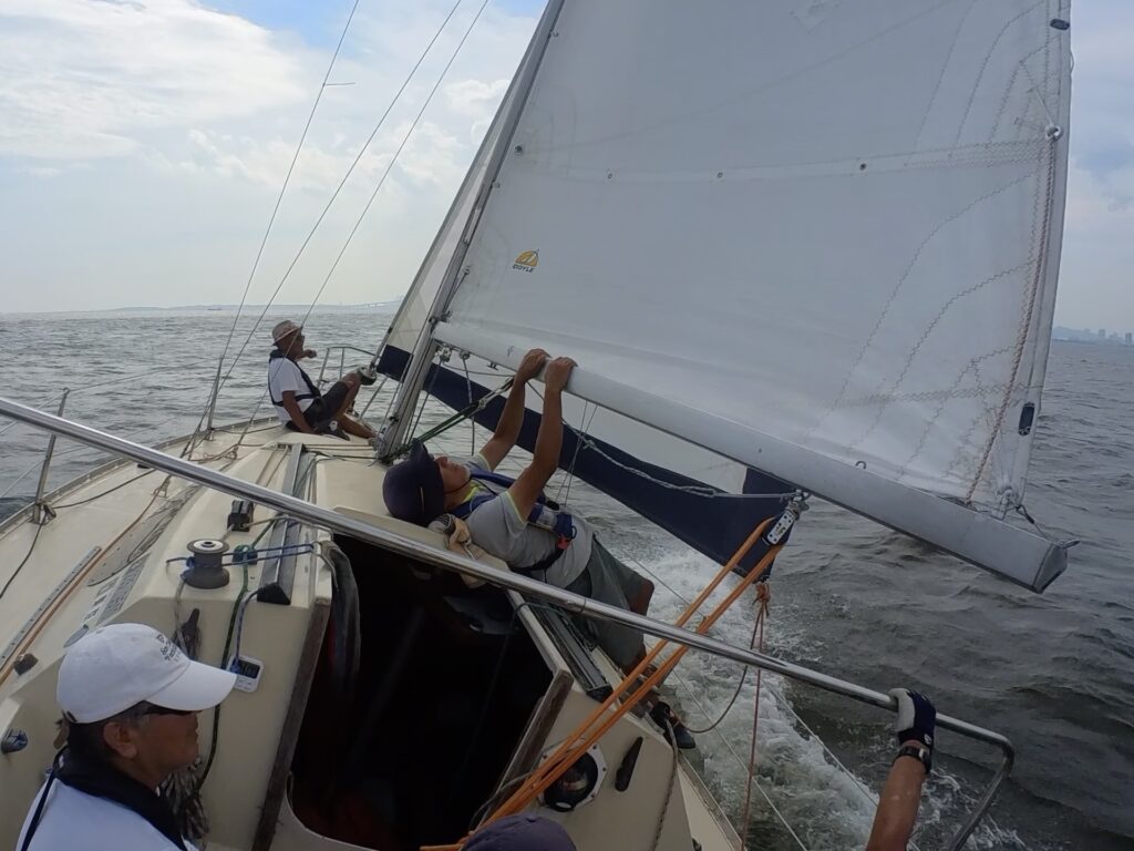 よっしゃと回航してからジブをたたんでスピン用意、膨らませるのに一苦労ありましたが走り始めたら恐ろしいスピードで走り始め、ザッパザッパと波を切る音がスピード感ありすぎてめっさ怖かった・・・。