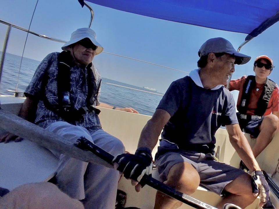 副田さん手作りの「ビミニトップ」(日除け)が施されたあほうどりは、真夏の海へと進みます。